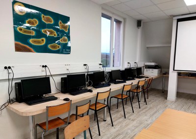 Chaque classe possède également son propre ordinateur. Tout l’établissement est connecté au réseau internet par câble, il n’y a pas de bornes Wifi pour éviter la circulation des ondes.